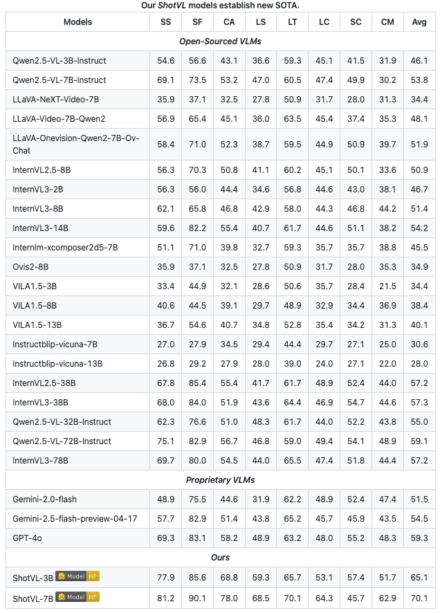为此,我们进一步构建了大规模训练集 ShotQA,并提出以 SFT+GRPO 训练的 ShotVL,在各维度与总体结果上均取得领先表现。