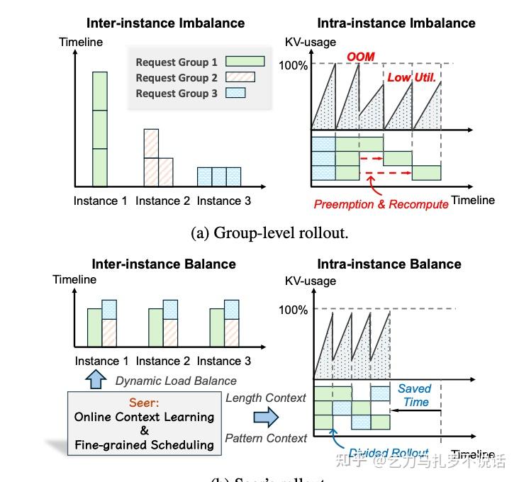 - Seer (Divided Rollout):将长任务切碎,利用全局 kvcache 池调度,系统利用率最高,无计算浪费,但对基础设施(网络带宽、KV Cache池)要求最高。