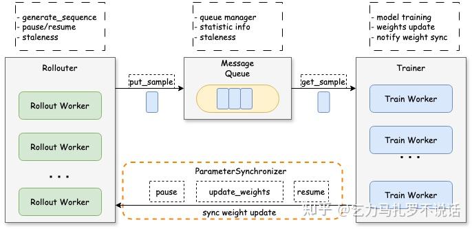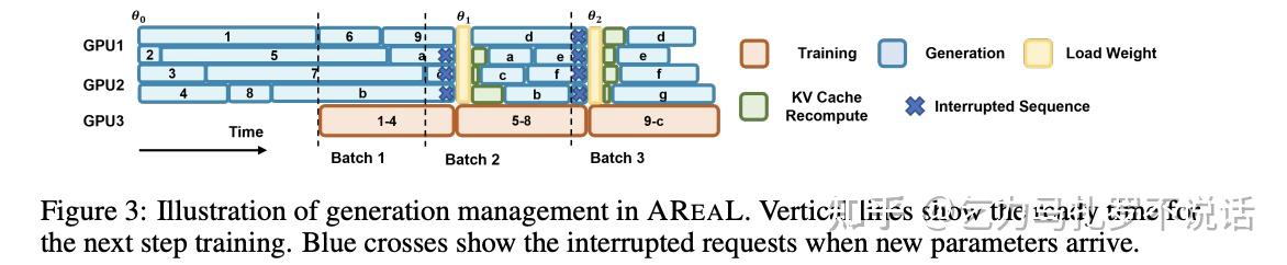 - Interruptible Generation:保证训练端维持 batch size(train >> rollout), 为了维持训练端的 Batch Size 稳定,当 Replay Buffer 数据不足时,系统可以强制挂起长任务、优先产出短任务,实现抢占式调度。