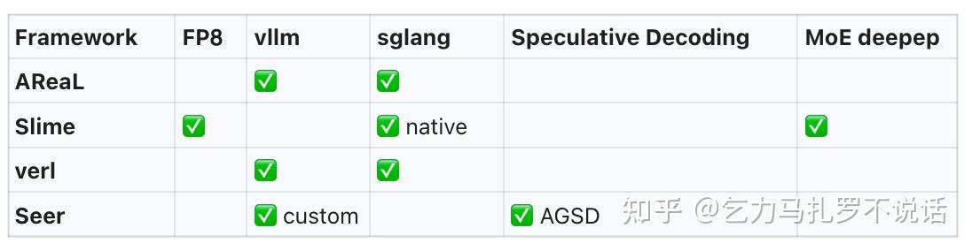 太长不看版本:直接点击全面对比和选型思路章节。所有框架几乎都较好复用和集成了 pretrain / inference 端的技巧,随着时间演进,也在互相集成对方的优秀 feature,但各自侧重点有所不同,AReaL 的异步推理, Seer 的极致同步,再到 Slime 的 MoE 和 verl 的易用性大一统,四个框架本质是在不同约束条件下的探索优化。