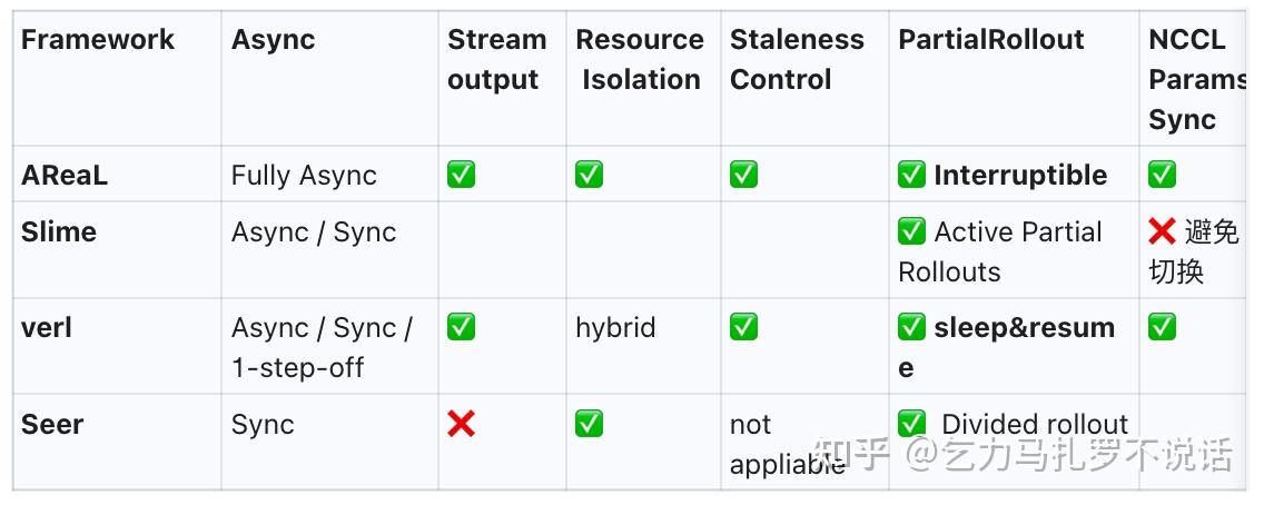 - verl / AReaL (Sleep-Resume):允许长任务被中断(Sleep/interupt)和下一轮 Resume,不浪费 token,更适合计算比较贵的场景。