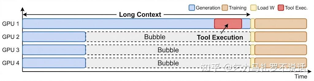 - Long-tail Effect: 在 GRPO/PPO 中,一个 Batch 的结束取决于最长的那条轨迹(Longest Trajectory)。Agentic 任务的输出长度极不平衡,也遵循二八定律,频繁触达 Context Window 上限的轨迹往往是不可替代和最有价值的的 Hard Exploration Case。这种 Long-tail Effect 导致同一个 Batch 长短不一,显卡持续等待中空转,进一步增加了 bubble 占比。
