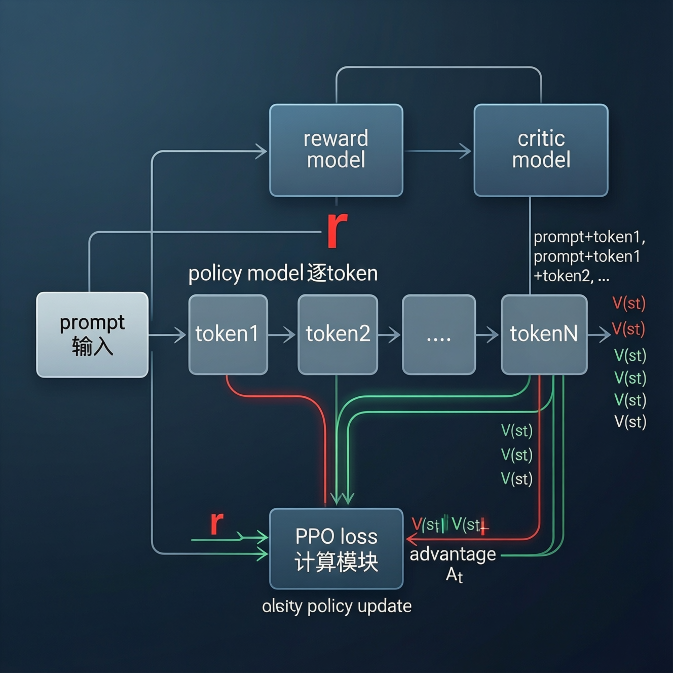 三者构成一个闭环:policy 生成样本 → RM 打分 → critic 估计价值 → 计算 advantage → 更新 policy。