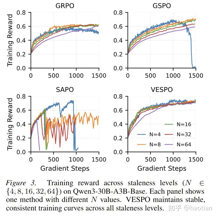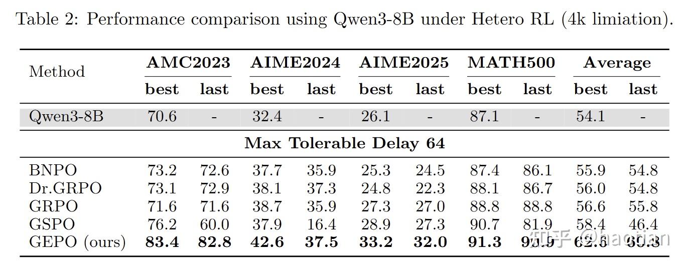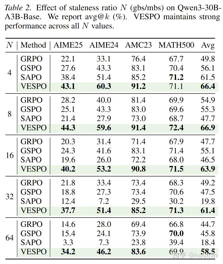 当然,由于gepo、vespo两个工作使用的数据集不相同,且gepo主要在异构芯片上的实验,两个工作相当难直接对比(需要额外跑实验)。但这两个工作都提供了比较好的视角:staleness比较大时候,如何保持训练稳定性。