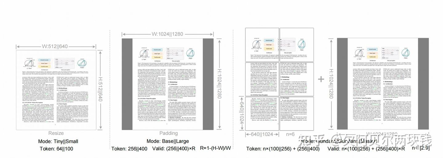 DeepEncoder(视觉编码器):结合SAM(局部感知)与CLIP(全局知识),加入16×卷积压缩模块(将4096个patch token压至256个),支持多分辨率输入(含“高达模式”动态拼接),激活内存低,适合高分辨率文档。