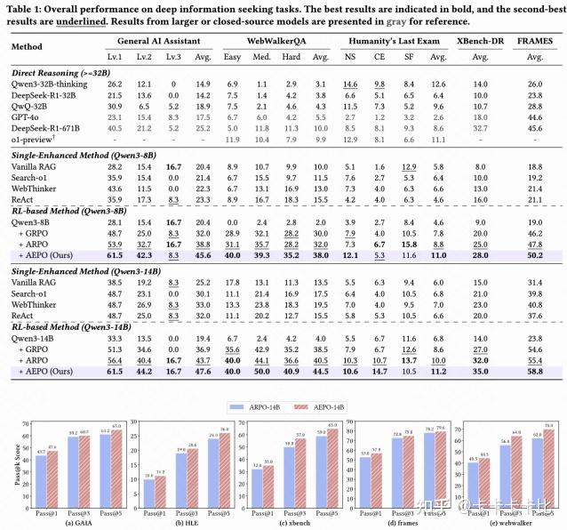 • 对比传统RL(GRPO、Reinforce++):AEPO在HLE任务上领先2.6%-3.4%,在Qwen3-14B基座上取得了11.2%的Pass@1与26%的Pass@5,凸显Agentic RL中熵平衡的必要性。