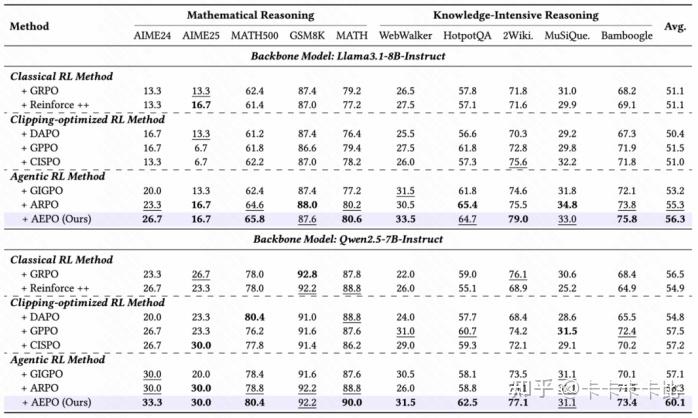 l Agentic RL算法具备泛化能力:ARPO,GIGPO,AEPO等算法在不同模型上表现稳定,证明在高熵环境下的分支探索有效。