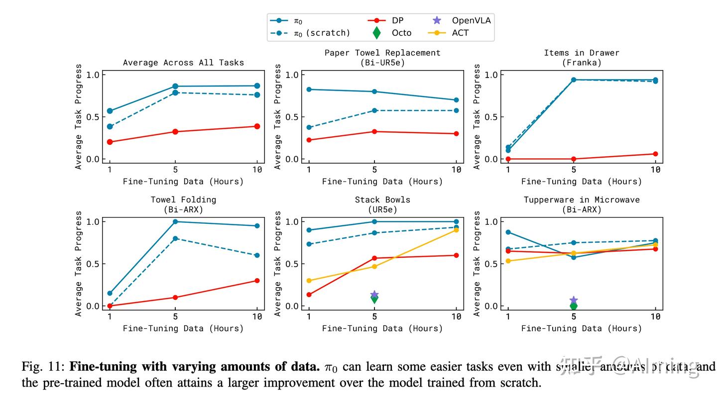 将微调后的pi0模型与 OpenVLA 和 Octo 进行了比较,它们也采用了预训练和微调策略。
