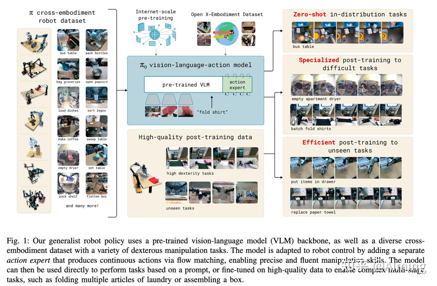 那么接下来学习并深度解析一下具身智能的经典VLA方案。也就是Pi-0(后面还有pi0.5/pi0-fast)。这都是Physical Intelligence的经典工作。这类的方案具有多任务的泛化性与实时推理能力,也被称之为“Generalist Policy”(通才策略)