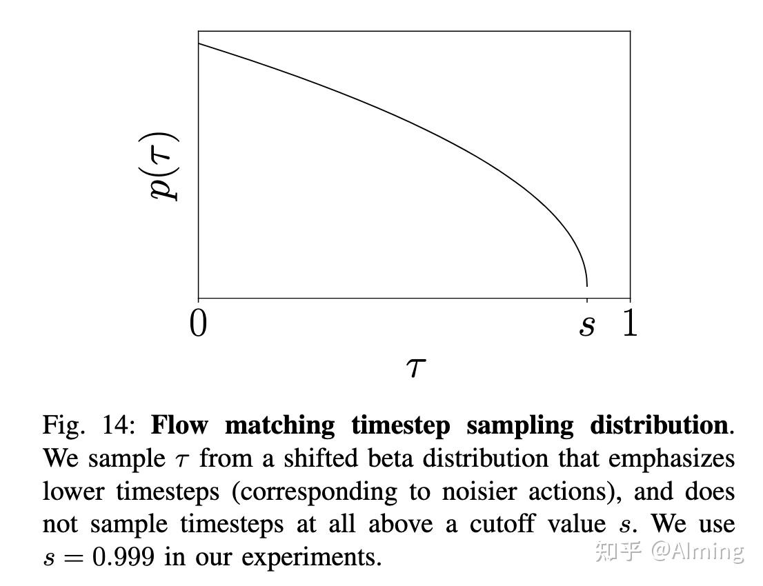t 下标表示机器人时间步, \tau 上标表示flow matching的时间步,其中 \tau ∈ [0, 1]。先前的工作(比如Movie gen)已经证明了,flow matching与简单的Linear-Gaussian概率路径或者Optimal Transport(OT,最优传输)路径相结合时,效果很好。