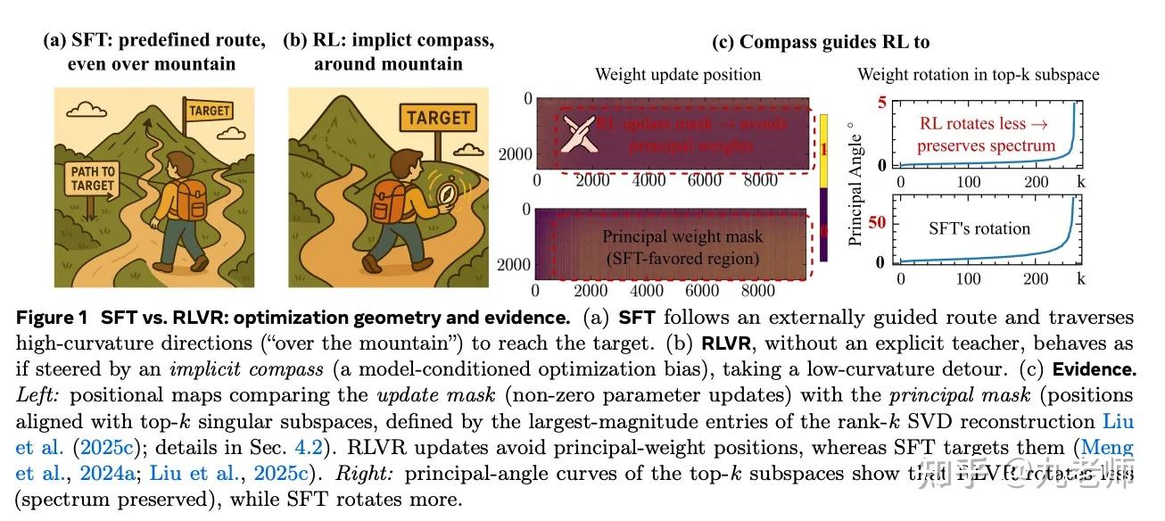 “The Path Not Taken: RLVR Provably Learns Off the Principals” 宣称bf16下,RLVR(Reinforce Leaning with verifiable rewards)显示约 36%-92% 参数没有改变,而 SFT 只有约 1%-19%。RL看似只“调动”了少量参数,却能显著提升模型能力。它认为机制是,RL在权重空间中避开主方向(principal directions)进行优化,也就是“off-principal”学习。SFT 更新主权重、造成谱结构扭曲、子空间大幅旋转,造成了灾难性遗忘。
