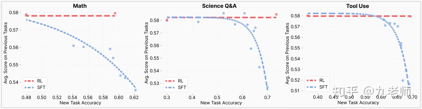 最近陆续有了一些研究LLM中RL相比SFT更不容易造成灾难性遗忘的工作,清晰地指出是RL的On-Policy特性带来了参数的稳定,而SFT将模型参数推向与预训练分布差异很大的方向,导致了遗忘问题(如图,遗忘问题的衡量就是随着新任务的学习,旧任务的平均表现下降)。