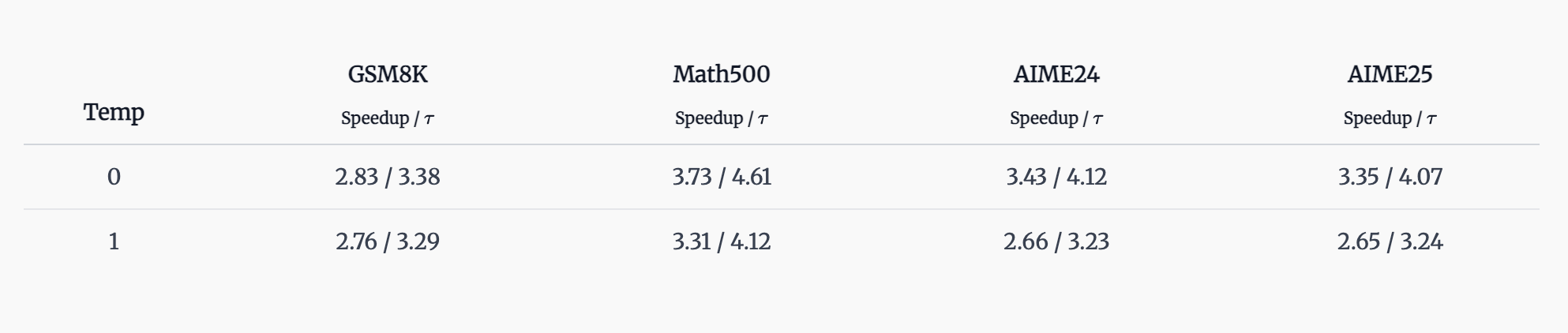我们将每个任务的最大生成长度设置为 2048。所有测试均禁用 Qwen3 模型的“思考”模式。接受与否通过草稿样本和目标样本之间的直接匹配来确定。