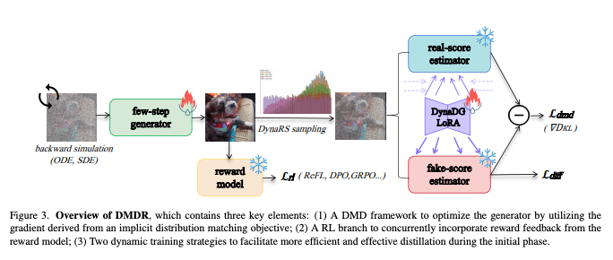 - DMD 为 RL “护航”: 扩散模型的 RL 极易陷入奖励作弊(Reward hacking),而 DMD 损失函数充当了极佳的正则化项,确保模型在追求高奖励时不会偏离真实的图像分布。