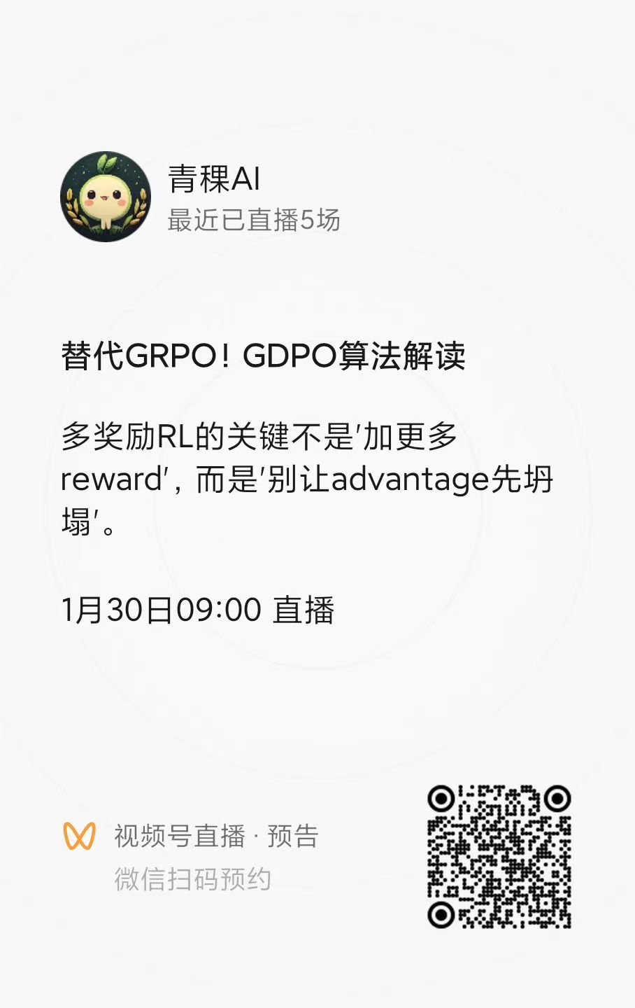 1月30日(周五)上午9点,青稞社区和减论平台将组织青稞Talk 第106期,香港科技大学博士候选人、 NVIDIA 研究实习生刘诗扬,直播分享《GDPO:解决 GRPO 在多奖励 RL 训练中的"优势崩溃"问题》。
