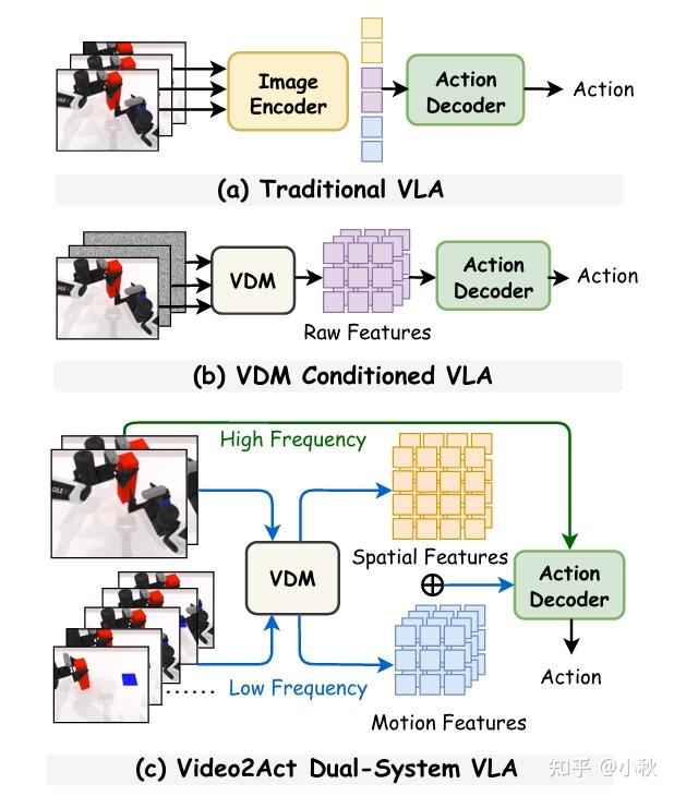 如果说 Helix 那一代快慢双系统工作,更多是在语义理解和低层控制之间把“大模型负责看、小模型负责动”这件事跑通,那 Video2Act 则在同一条路上往前挪了一格:它没有再去堆更大的多模态骨干,而是认真回答了一个更具体的问题——在真实机器人操作里,视频中的空间信息和运动信息应该怎样拆开建模,又怎样以一种算力可承受的方式输送给策略网络。