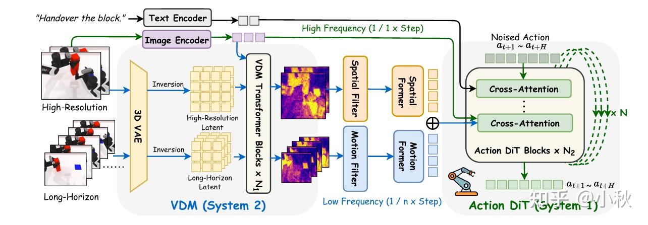 然后,这些表征被当作条件以交叉注意力的方式注入到 DiT 动作头里,让快系统在每次采样动作时,不是从一堆生硬的图像特征里自己摸索,而是带着“我要操作的对象在哪”“合理的运动趋势是什么”的先验去生成动作序列。