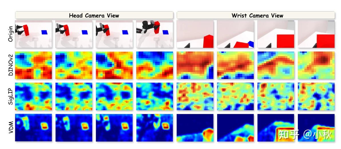 高亮区域表示对模型特征响应贡献最大的空间位置,从而以类似注意力的方式可视化模型的关注点分布,相比之下,VDM 的特征始终聚焦于被操作的前景物体,即使在剧烈的自我运动(ego-motion)下也能保持强大的空间结构感知能力。