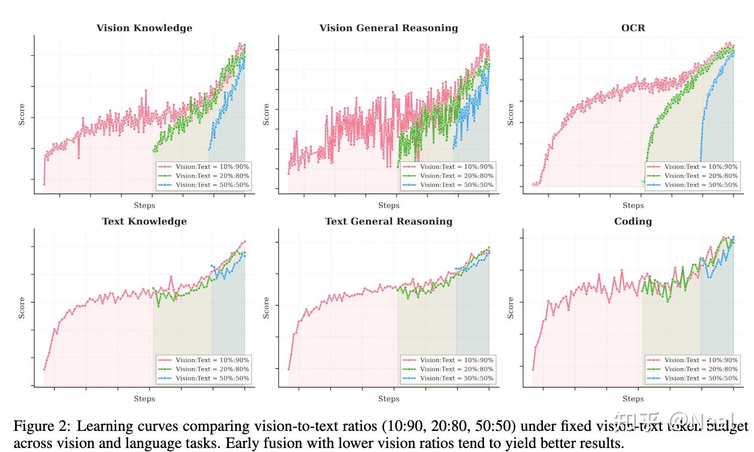 这直接指导了我们的训练策略:不需要激进的 vision-heavy training,而是采用适中的 vision ratio,在训练早期就 integrate。