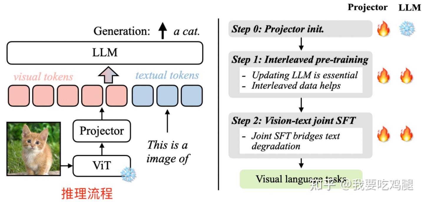例如,当用户输入一张图片并提问“What is in the image?”时,LLM 的最终输入会是 [视觉词元1, ..., 视觉词元196, "What", "is", "in", "the", "image", "?"] 这样拼接后的形态。