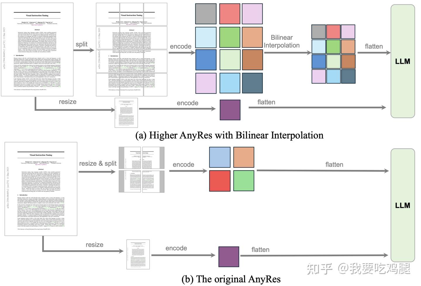 - 高级 AnyRes (Higher AnyRes with Bilinear Interpolation): 如图 (a) 所示,它在编码完各个高清图块后,增加了一个关键步骤——双线性插值 (Bilinear Interpolation)。它不再是将特征向量粗暴地拼接,而是尝试在特征空间中,通过插值的方式将这些离散的特征图块“缝合”起来,重新构建一个更高分辨率的特征图 (Feature Map)。然后再将这个融合了空间信息的完整特征图展平送入 LLM。这种方式能更好地保留文档的布局、表格的结构等至关重要的空间关系,极大地提升了模型在文档视觉问答 (DocVQA) 等任务上的表现。