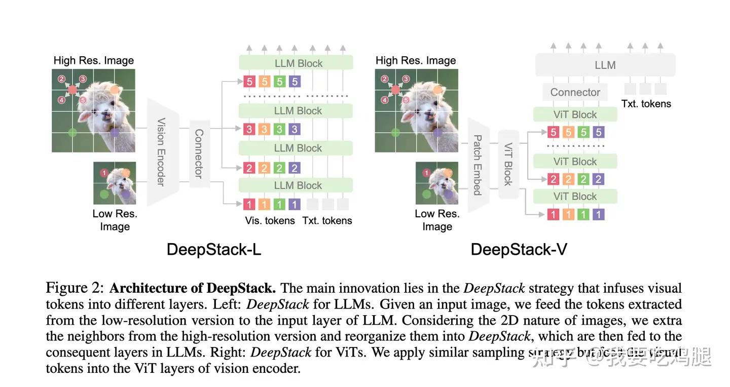 - DeepStack-V (for ViTs): 这是将视觉信息注入到视觉编码器(ViT)自身的版本。整个注入过程都发生在 ViT 内部,旨在视觉编码阶段就构建一个多尺度的层次化视觉表征。