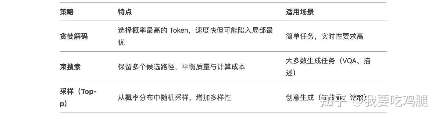- 采样 (Top-p): 与前两种确定性策略不同,采样策略引入了随机性。它不会总是选择概率最高的词,而是根据概率分布进行随机抽样,通常会限定在一个较小的、高质量的候选词集合内(例如 Top-p 采样)。这极大地增加了生成文本的多样性和创造性,使其非常适合需要“灵感迸发”的场景,如根据图片写故事、创作诗歌等。