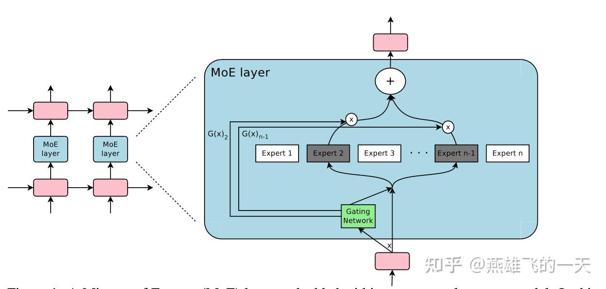 整体架构: 混合专家(MoE)层由一组n个expert networks 和一个“gating network” 组成,其中门控网络的输出是一个稀疏的n$$维向量。图上图展示了该 MoE 模块的架构概览。这些“expert”本身也是networks,且每个专家都拥有各自独立的参数,并要求这些专家能够接收相同尺寸的输入并产生相同尺寸的输出