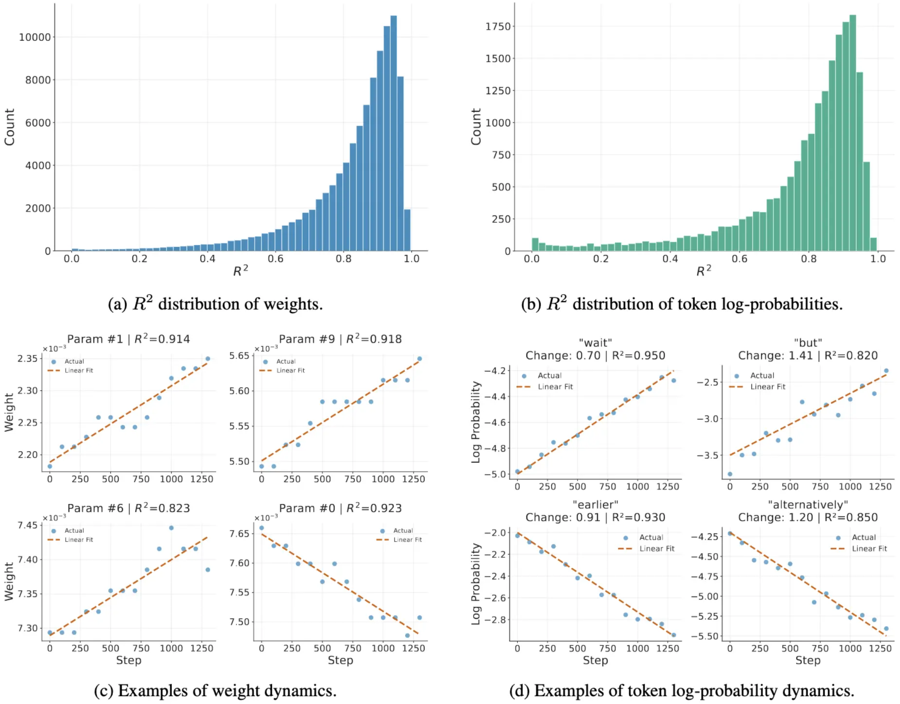 (图注:左图为权重的 R^2 分布,右图为 token 对数概率的变化,可见明显的线性趋势)