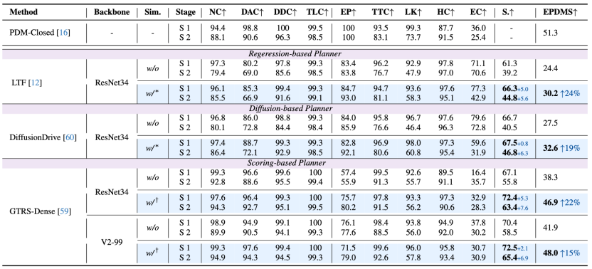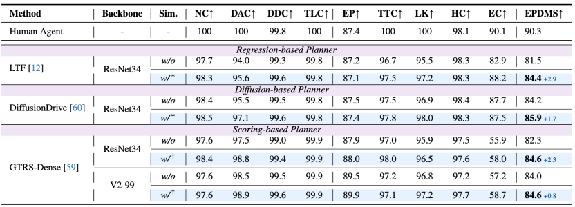 所有类型的端到端规划器的性能也有明显增强,最多可提升2.9 EPDMS.