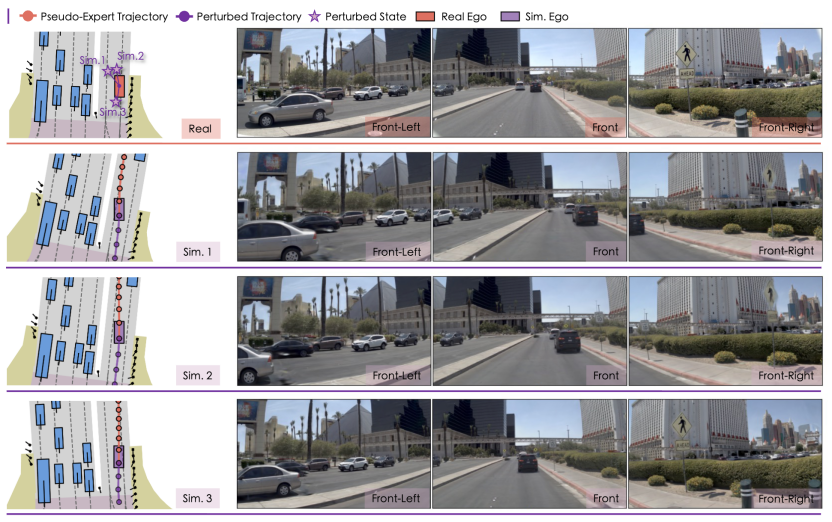 • 一个能“无限扩张世界”的仿真生成框架:通过高保真神经渲染,自动制造多样化反应式交通场景与伪专家示范。