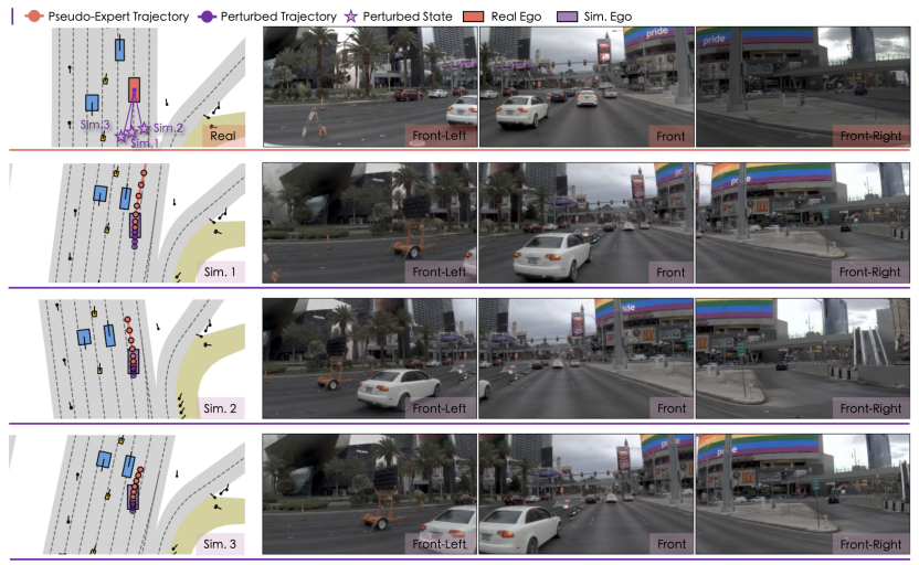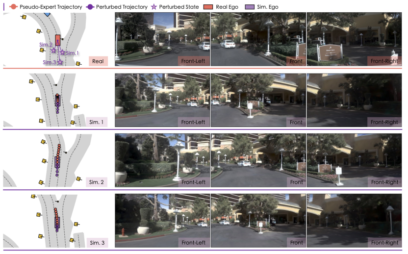 这些操作会让自车进入现实中难以遇见的危险情形,如偏离车道、逼近障碍物或激进交互,从而系统性扩展策略的可见状态空间,提供人驾数据中无法安全采集的数据。