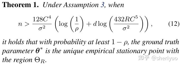 在这些设定下,论文的第一个主要结论是:在充分覆盖(假设 3)条件下,且样本数 n 足够大时,经验驻点 \Theta_R := \{\boldsymbol\theta \in \mathbb R^d \mid \|\boldsymbol\theta\| \leq R \} 唯一且等于真实参数 \boldsymbol\theta^*。