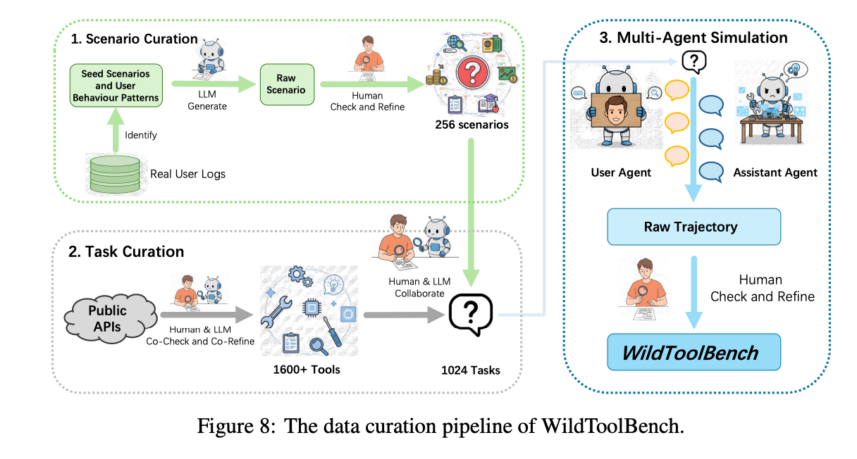 WildToolBench 的诞生,正是为了填补这一空白。它以真实用户行为模式为基石,通过精心设计的数据 pipeline,结合人工验证与标注,构建了 256 个场景、1024 项任务的庞大测试集。