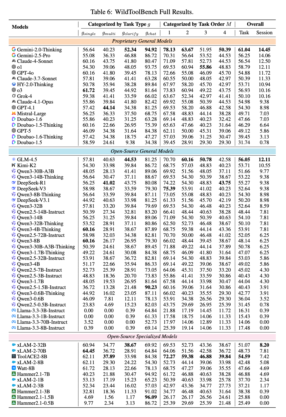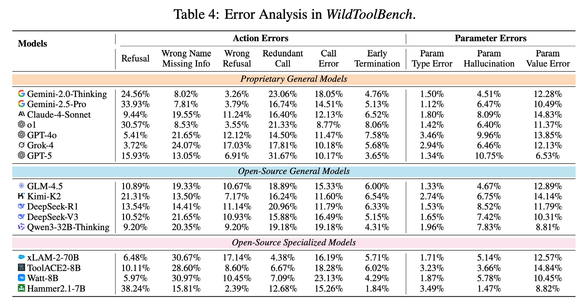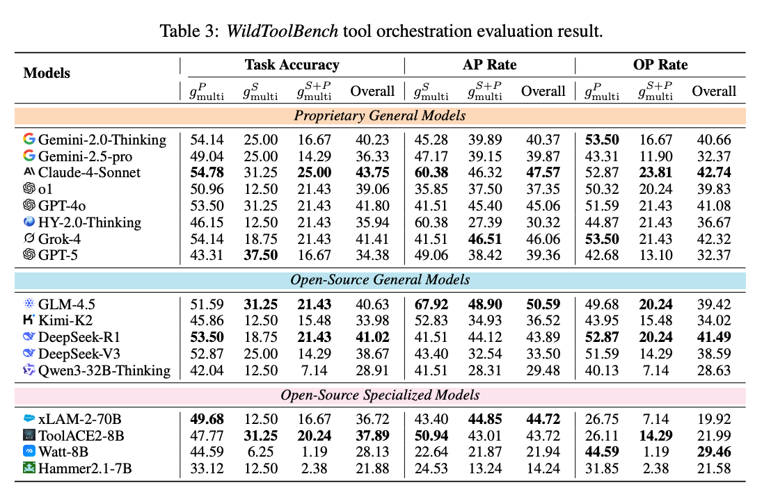 为验证 WildToolBench 的有效性,研究团队对 58 款主流 LLMs 展开了全面评估,涵盖闭源通用模型(如 Gemini 系列、Claude系列、GPT 系列)、开源通用模型(如 GLM-4.5、Kimi-K2)以及开源专用工具模型。