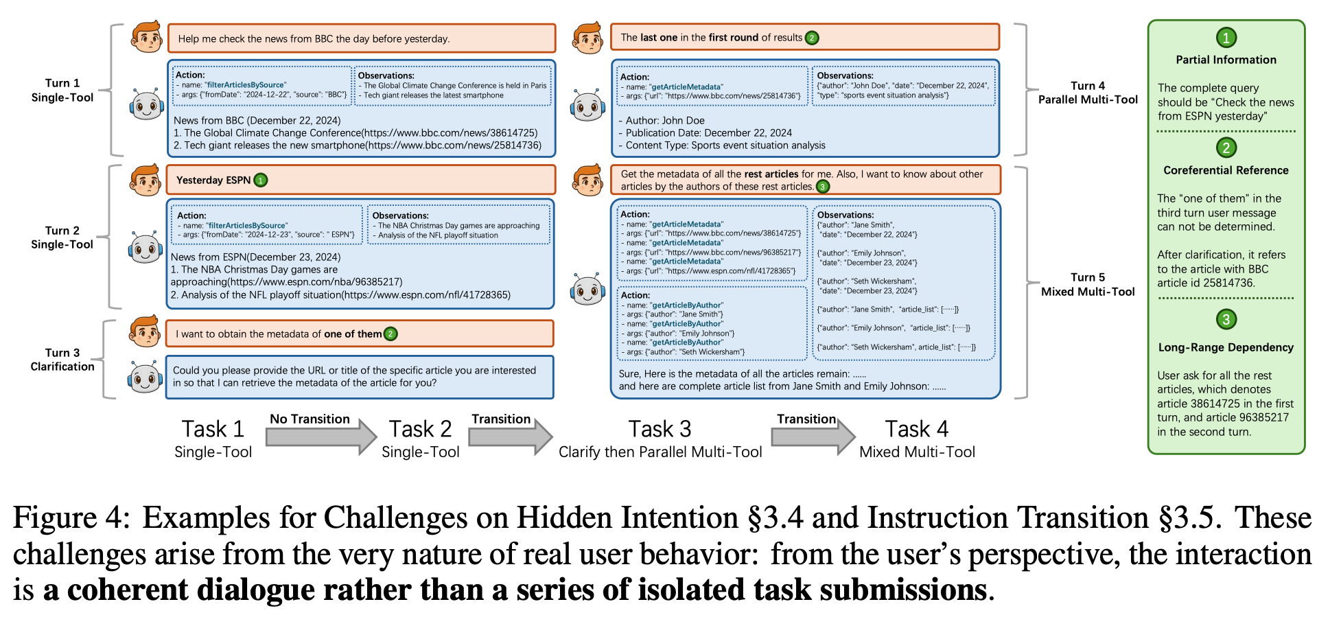 它们往往将用户需求简化为明确、独立的任务,忽略了真实对话中用户行为的复杂性 —— 用户可能在一次对话中提出包含多个简单需求的复合任务,需要 Agent 高效协调多种工具;也可能将真实意图隐藏在多轮对话的上下文之中,要求 Agent 主动推断;更会在任务查询、澄清疑问与日常闲聊之间灵活切换,迫使 Agent 实时调整应对策略。