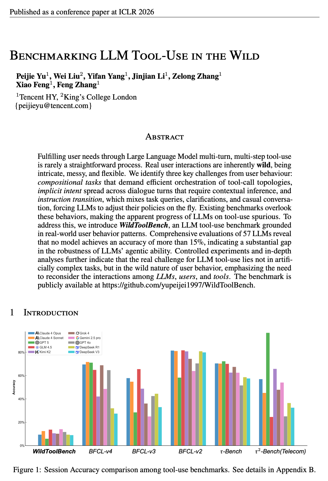 现有基准测试忽视了这些行为,导致 LLM 在工具调用方面的表面进展存在误导性。为此,我们提出 WildToolBench—— 一个基于真实用户行为模式的 LLM 工具调用基准测试。对 58 个 LLM 的综合评估显示,无任何模型的准确率超过 15%,这表明 LLM 智能体能力的稳健性仍存在巨大差距。