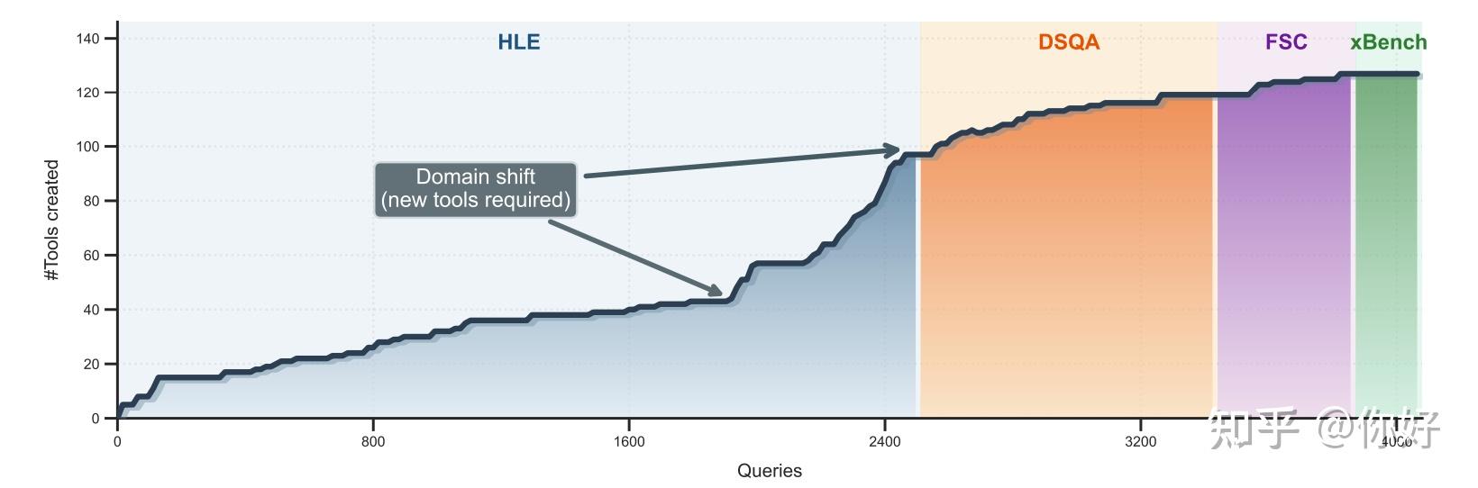 为了验证自进化智能体所积累能力的跨领域迁移性,我们进一步设计了顺序式实验:首先在覆盖面广、规模较大的 HLE 数据集上“从零造工具”,随后将得到的工具库依次迁移到 DeepSearchQA,并继续用于金融与深度检索等更专业的任务。