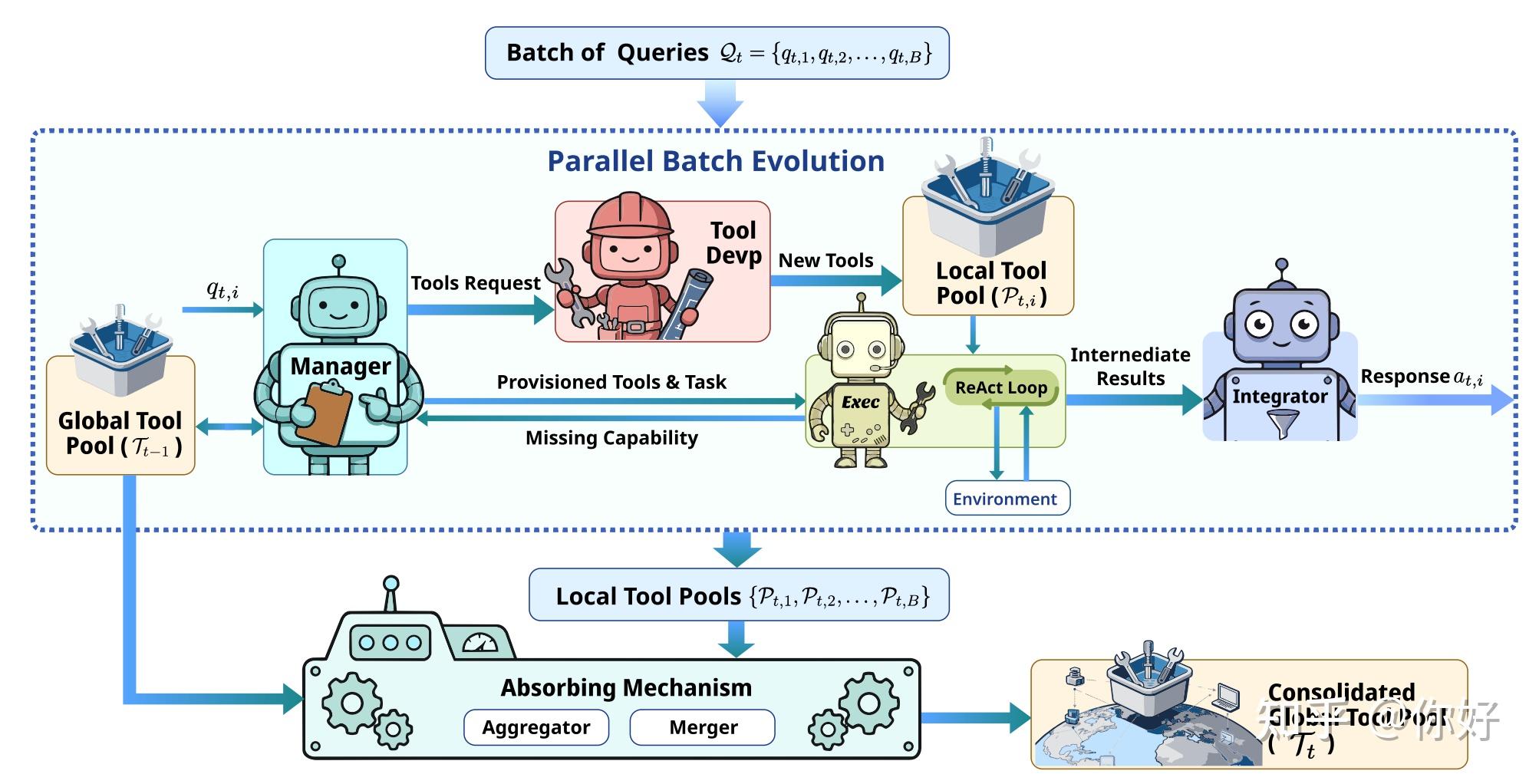 基于此,我们首先以“工具自进化”为核心路径,构建了 Yunjue Agent,让智能体在任务中自动生成、优化并复用新工具,并将有效能力沉淀为可迁移的通用工具库。