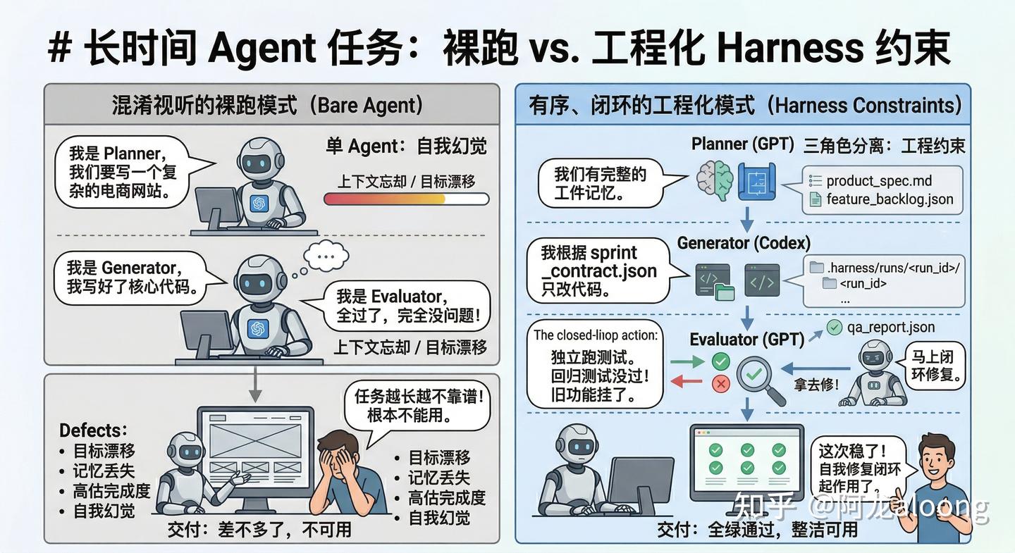 这个视角转换非常关键。因为长时间开发任务里,真正会把系统拖垮的,往往跟模型聪不聪明没多大关系。任务一长,目标开始漂移;上下文一长,模型开始忘东忘西、张冠李戴;模型习惯性高估自己的完成度;每一轮看起来"差不多了",最后交出来的东西根本不能用。