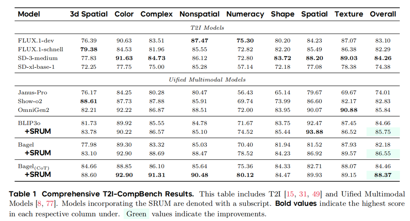 由此,SRUM通过一些指令设计,能让理解端能够直接为生成端提供密集的奖励信号。实验上,仅使用约6k条提示和极少的训练时间,就能在T2I-CompBench上提升4–6个点,并在Geneval,WISE,T2I-Reasonbench上表现出优秀的泛化性能。