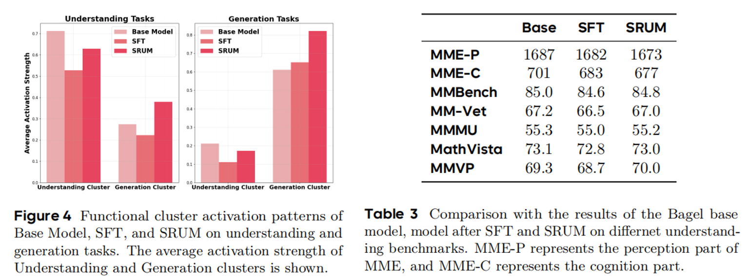 而且有意思的是,在观察不同参数聚类的激活情况结果,我们可以发现SRUM能够同时促进理解和生成簇在不同任务的激活,使得模型能力出现了一种潜在的协同,这是一个非常积极的信号(我会在最后结合谈这一点)。