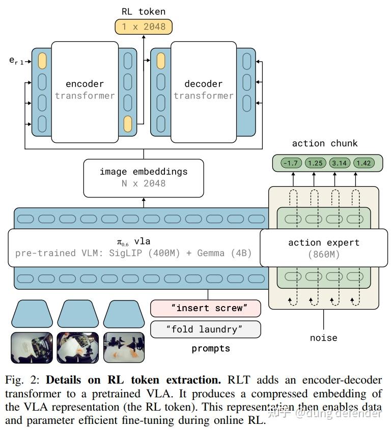 既然我们希望这个修正policy可以高效学习,那这个网络结构,以及输入输出最好做的比较compact,所以这篇工作提出一个叫RL token的概念,实际上相当于就是对VLA的输入的hidden state做了压缩,得到一个更加紧凑的表达。
