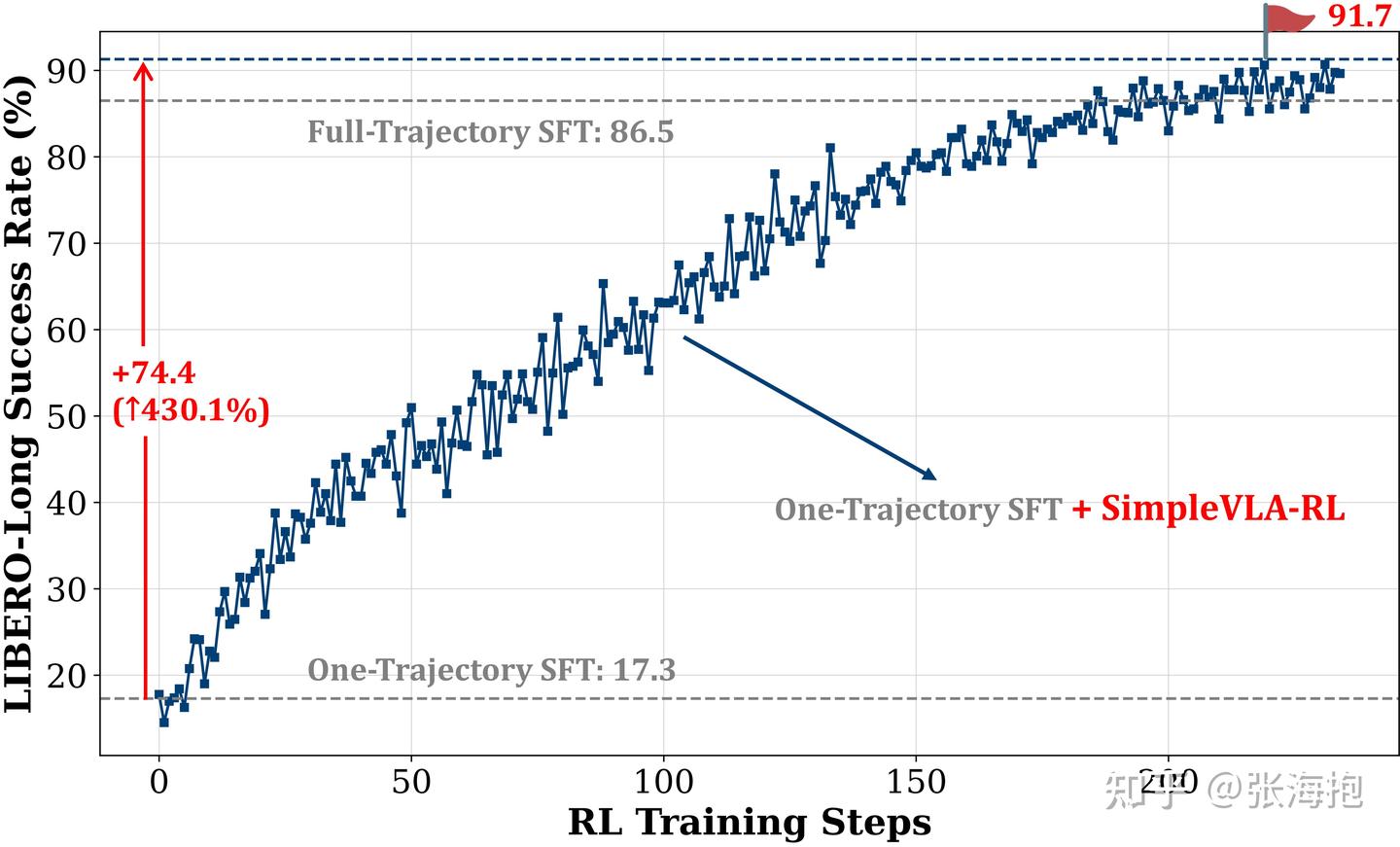 一句话概括?对于预训练好的 VLA 模型,仅基于稀疏的奖励和与环境的交互,训练 RL 使模型执行成功率提高。