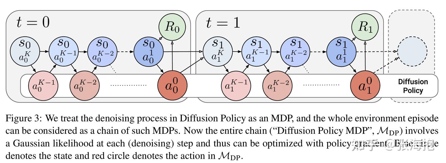 算法建模上有什么差别?从上图可以看出,建模上把每个 diffusion step 当做了 MDP 的一步,然后用 environment step 把它们串起来了,这样形成了一个 TK 步 的 MDP,其中 T 是环境的步数, K 是 diffusion 的步数。