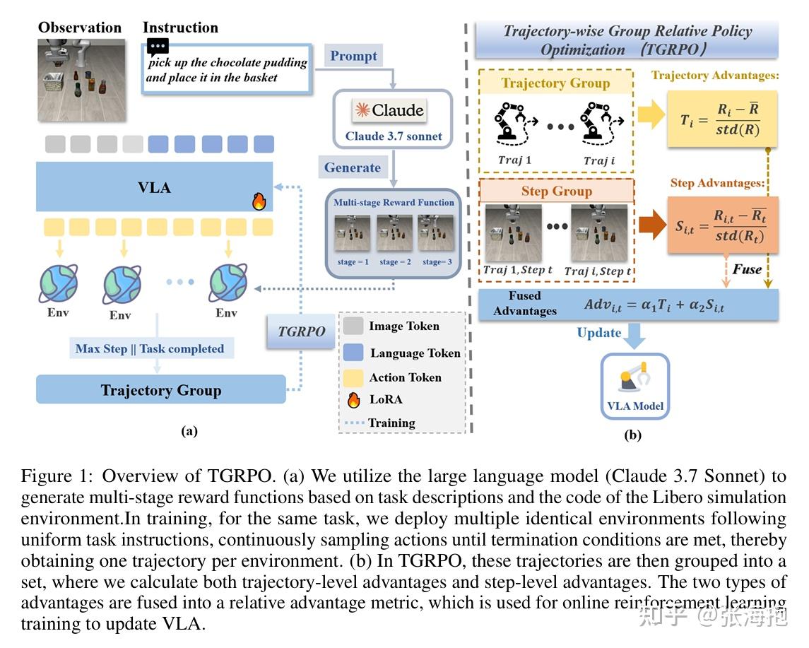 一句话概括?考虑对 VLA 做 RL,这里使用了类似 GRPO 的方法来做优化。针对奖励函数稀疏的问题,这里使用 Glaude 3.7 sonnet 去分阶段产生各个任务的奖励函数。