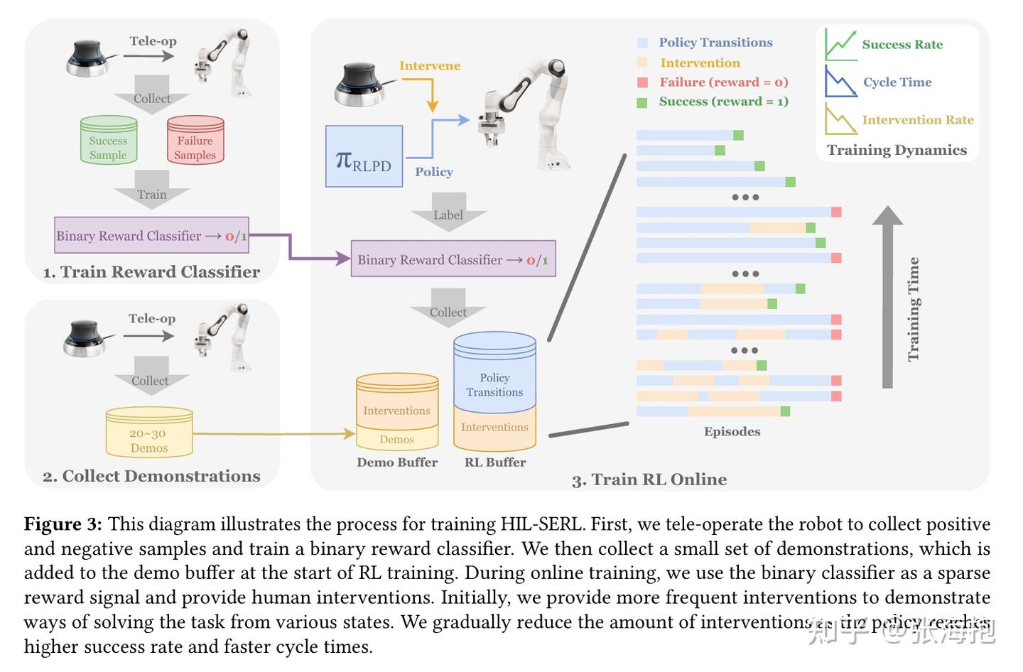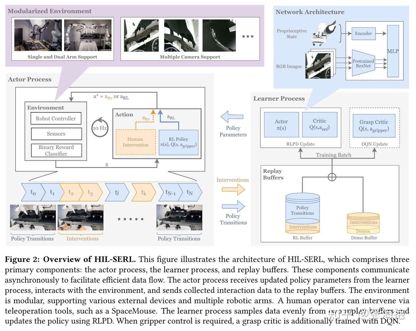 一句话概括?在 SERL 的基础上,设计了 human-in-the-loop 的方案,人类可以在轨迹中途接管 RL 探索,产生的轨迹一样可以记录到强化学习的 buffer 里面帮助 RL 学习。