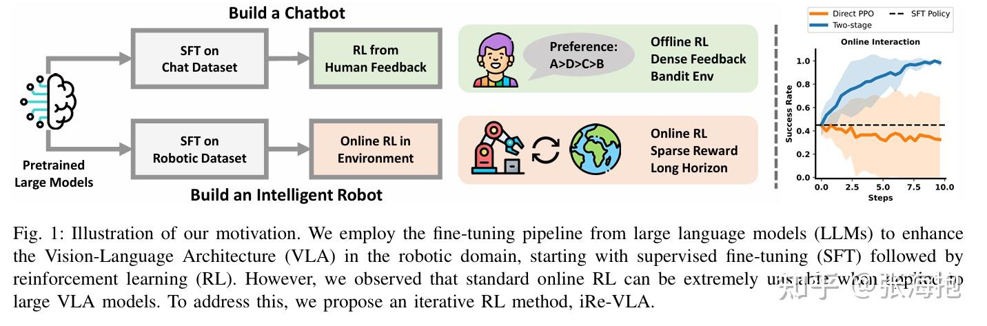 一句话概括?考虑对于预训练好的 VLA 模型做 RL 训练,把机器人的轨迹当做多模态多轮对话,由此借用 LLM 上的模式来训练 —— 训练 process reward model (PRM)并进行 PPO 训练。