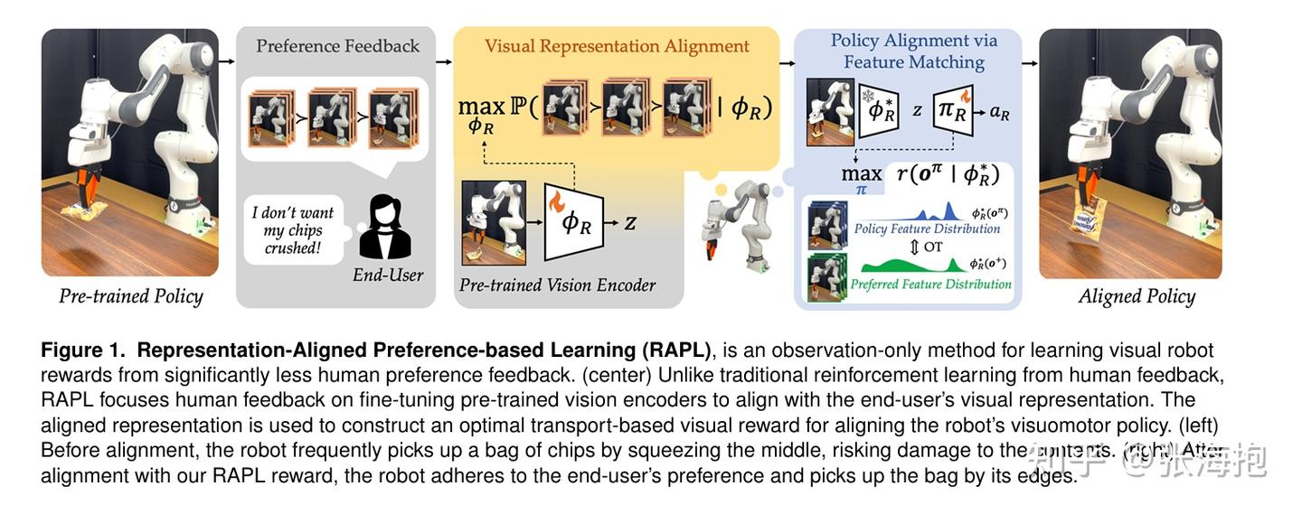 一句话概括?目标是调整 VLA 模型,使其能够按照人类偏好完成任务(比如夹杯子的把手、叉子的柄)。这里考虑利用少量(20 条)标注好排序的人类偏好轨迹,训练一个视觉输入的奖励函数;基于此奖励函数微调 VLA 得到更符合人类偏好的轨迹。