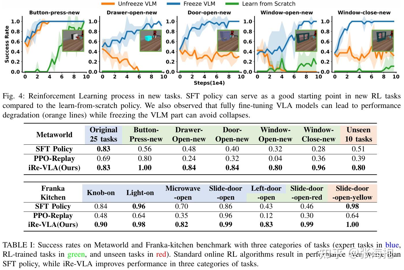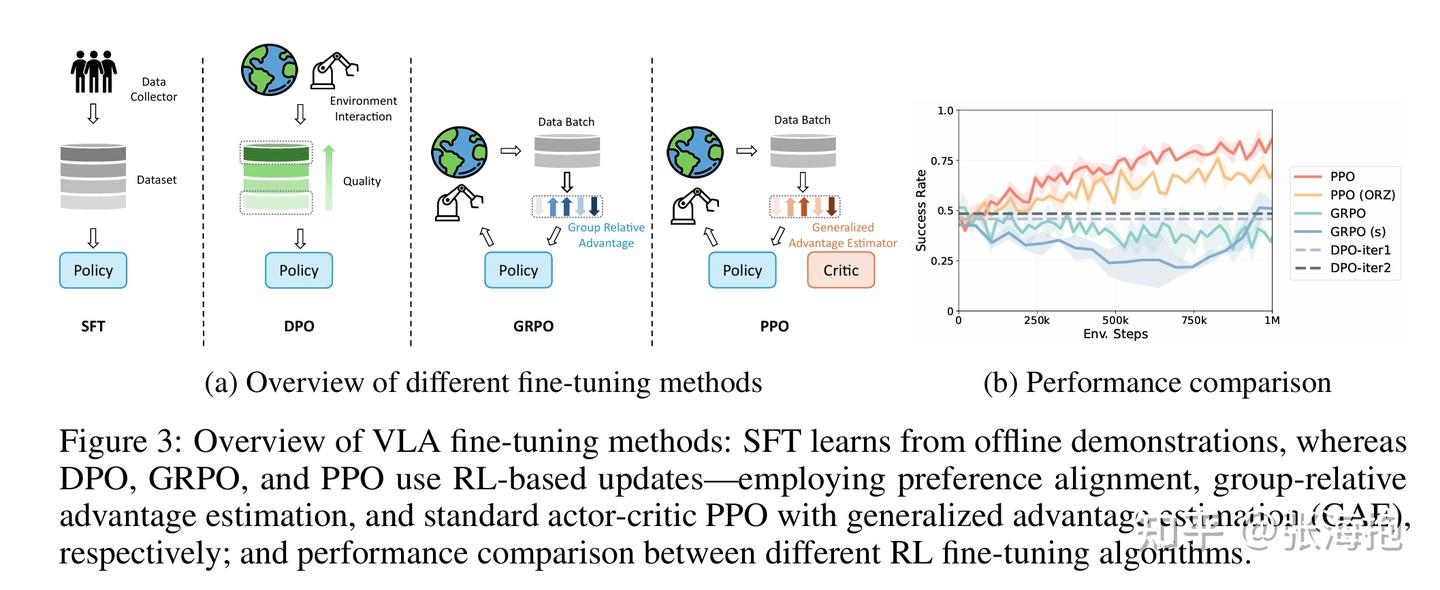 什么样的 RL 算法对 VLA 更有帮助?这里发现还是 PPO 效果更好。不过作者告诉我可能 GRPO 也能调好,不过由于其涉及到分组的策略,因此较为复杂。